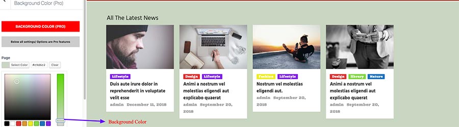 - Go to dashboard and navigate to Appearance > Customizing > Color Options (Pro) > Background Color (Pro)