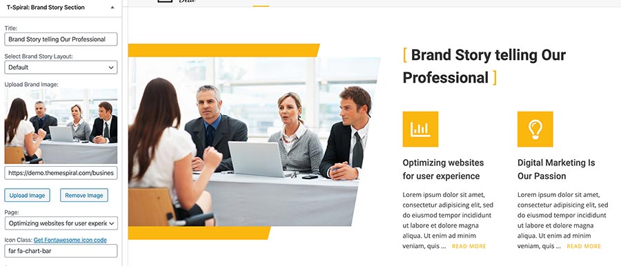 - Now, Go to dashboard > Appearance > Widgets > Drag T-Freesia: Brand Story Section to BusinessDeal Template main section sidebar