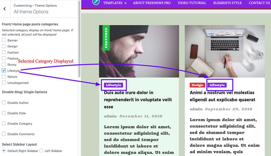 - Go to dashboard and navigate to Appearance > Customizing > Theme Options > All theme Options > Front/ Home page posts categories
