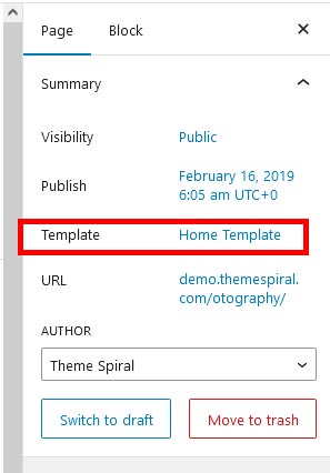 - In the page editor, there is a box on the right called Page> Template. From this box, you can select multiple page templates. Select “Home Template” and save the page.